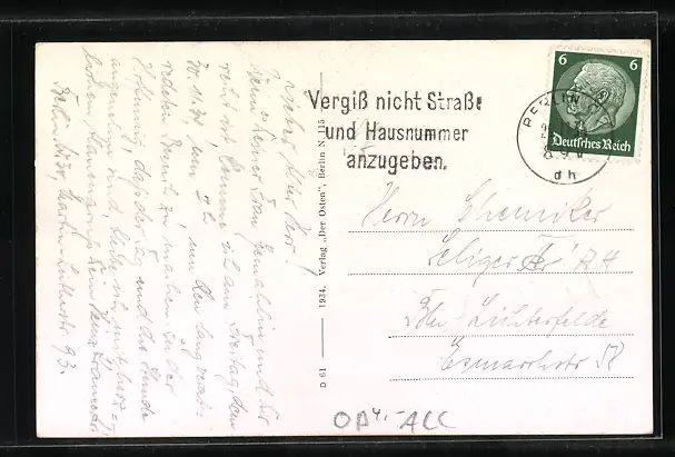 Personenbezogene Daten auf der Rückseite der Karte wurden durch blauen Textmarker unkenntlich gemacht. Die blauen Stellen sind auf die Vorderseite durchgeweicht und wirken sich negativ auf das Postkartenfoto aus