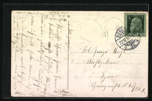 Personenbezogene Daten auf der Rückseite der Karte wurden durch blauen Textmarker unkenntlich gemacht. Die blauen Stellen sind auf die Vorderseite durchgeweicht und wirken sich negativ auf das Postkartenfoto aus