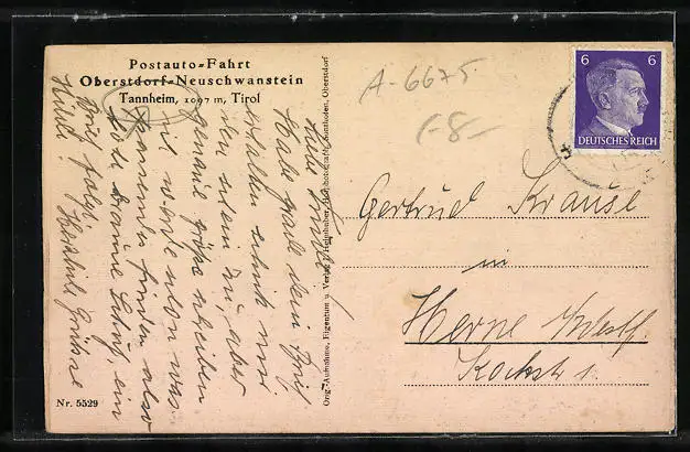 Personenbezogene Daten auf der Rückseite der Karte wurden durch blauen Textmarker unkenntlich gemacht. Die blauen Stellen sind auf die Vorderseite durchgeweicht und wirken sich negativ auf das Postkartenfoto aus