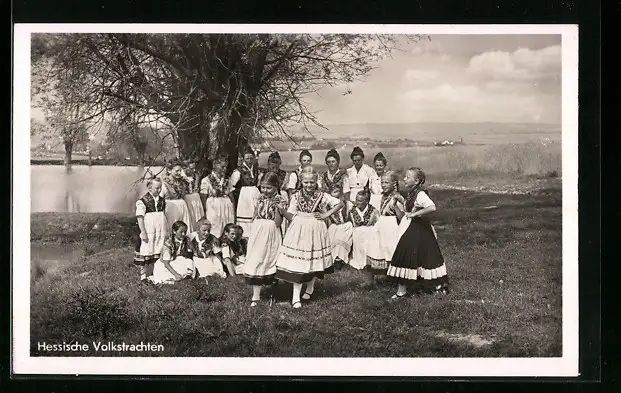AK Tanzende Mädchen auf der Wiese in hessischer Tracht
