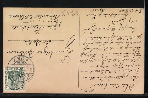 Personenbezogene Daten auf der Rückseite der Karte wurden durch blauen Textmarker unkenntlich gemacht. Die blauen Stellen sind auf die Vorderseite durchgeweicht und wirken sich negativ auf das Postkartenfoto aus