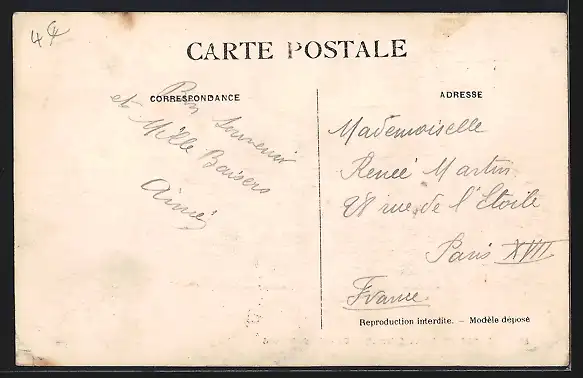 Personenbezogene Daten auf der Rückseite der Karte wurden durch blauen Textmarker unkenntlich gemacht. Die blauen Stellen sind auf die Vorderseite durchgeweicht und wirken sich negativ auf das Postkartenfoto aus