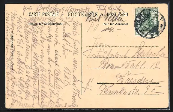 Personenbezogene Daten auf der Rückseite der Karte wurden durch blauen Textmarker unkenntlich gemacht. Die blauen Stellen sind auf die Vorderseite durchgeweicht und wirken sich negativ auf das Postkartenfoto aus