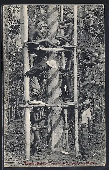 AK Tapping Rubber Trees with the aid of scaffolds, Kautschukernte