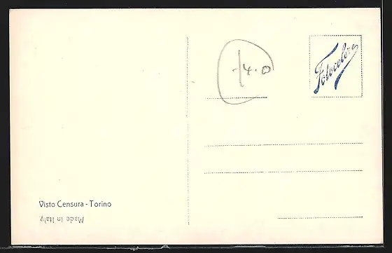 Personenbezogene Daten auf der Rückseite der Karte wurden durch blauen Textmarker unkenntlich gemacht. Die blauen Stellen sind auf die Vorderseite durchgeweicht und wirken sich negativ auf das Postkartenfoto aus