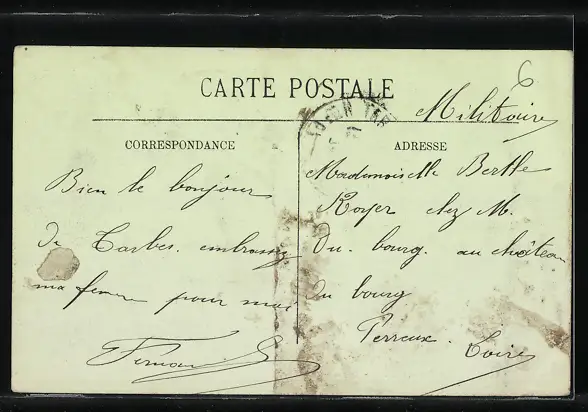 Personenbezogene Daten auf der Rückseite der Karte wurden durch blauen Textmarker unkenntlich gemacht. Die blauen Stellen sind auf die Vorderseite durchgeweicht und wirken sich negativ auf das Postkartenfoto aus