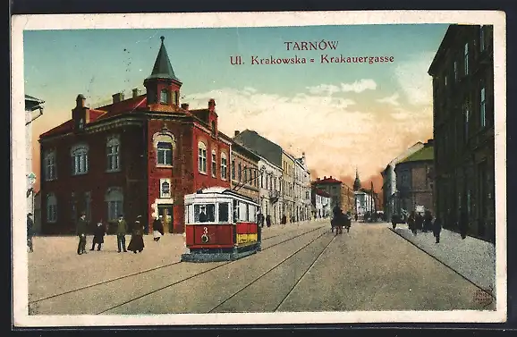 AK Tarnów, Krakauergasse mit fahrender Strassenbahn