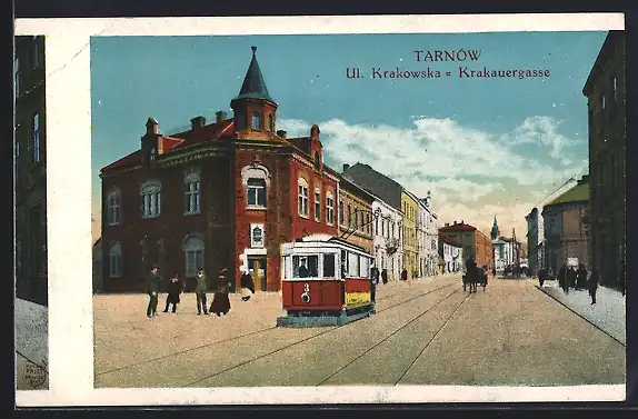 AK Tarnów, Strasse Krakauergasse mit Strassenbahn