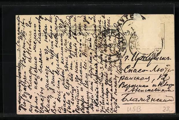 Personenbezogene Daten auf der Rückseite der Karte wurden durch blauen Textmarker unkenntlich gemacht. Die blauen Stellen sind auf die Vorderseite durchgeweicht und wirken sich negativ auf das Postkartenfoto aus