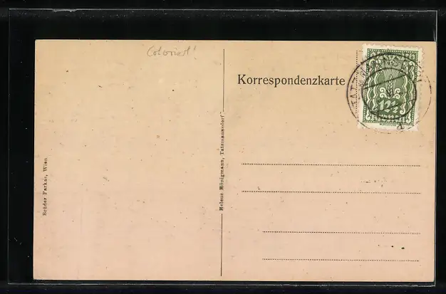 Personenbezogene Daten auf der Rückseite der Karte wurden durch blauen Textmarker unkenntlich gemacht. Die blauen Stellen sind auf die Vorderseite durchgeweicht und wirken sich negativ auf das Postkartenfoto aus