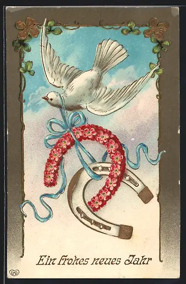 AK Taube fliegt mit Hufeisen aus roten Blüten