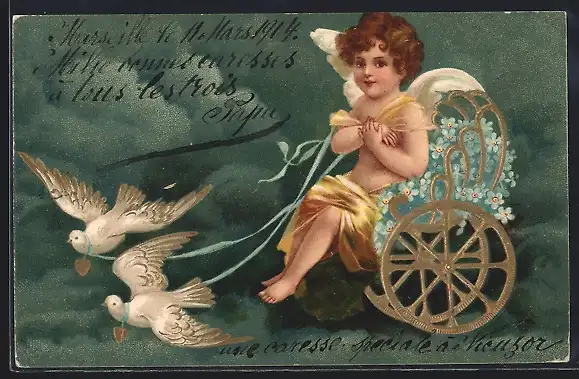 AK Tauben ziehen Amor in einem Wagen