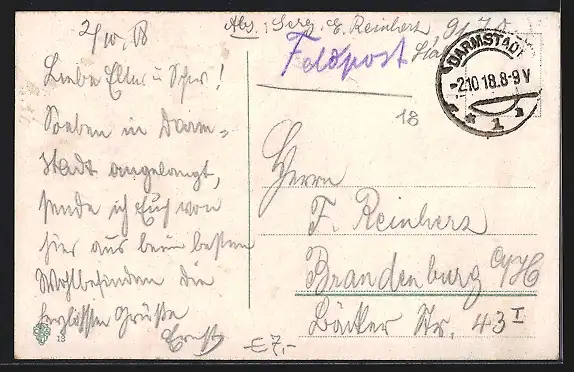 alte Ansichtskarte, gelaufen 1918, Eckknick oben re., Stempelspur, guter Zustand