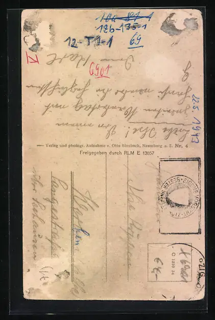 Personenbezogene Daten auf der Rückseite der Karte wurden durch blauen Textmarker unkenntlich gemacht. Die blauen Stellen sind auf die Vorderseite durchgeweicht und wirken sich negativ auf das Postkartenfoto aus