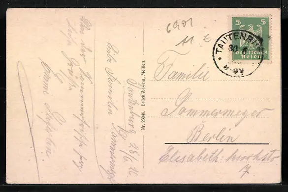 Personenbezogene Daten auf der Rückseite der Karte wurden durch blauen Textmarker unkenntlich gemacht. Die blauen Stellen sind auf die Vorderseite durchgeweicht und wirken sich negativ auf das Postkartenfoto aus