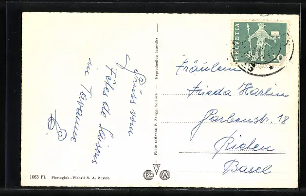 Personenbezogene Daten auf der Rückseite der Karte wurden durch blauen Textmarker unkenntlich gemacht. Die blauen Stellen sind auf die Vorderseite durchgeweicht und wirken sich negativ auf das Postkartenfoto aus
