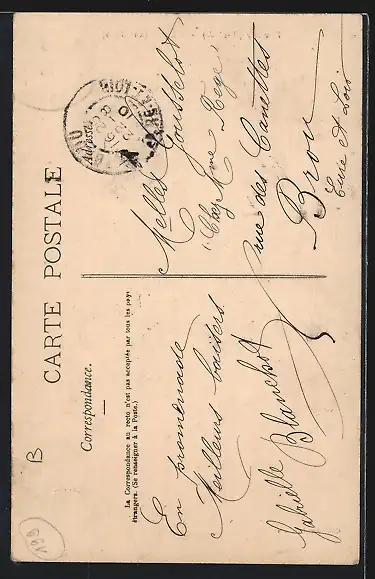 Personenbezogene Daten auf der Rückseite der Karte wurden durch blauen Textmarker unkenntlich gemacht. Die blauen Stellen sind auf die Vorderseite durchgeweicht und wirken sich negativ auf das Postkartenfoto aus