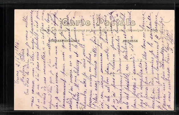 Personenbezogene Daten auf der Rückseite der Karte wurden durch blauen Textmarker unkenntlich gemacht. Die blauen Stellen sind auf die Vorderseite durchgeweicht und wirken sich negativ auf das Postkartenfoto aus