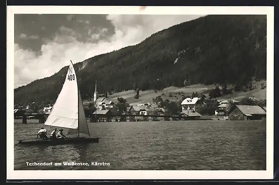 AK Techendorf am Weissensee, Ortsansicht mit Segelboot