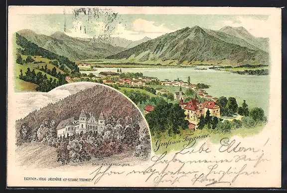 AK Tegernsee, Das Sengerschloss und Ortspanorama mit Bergmassiv