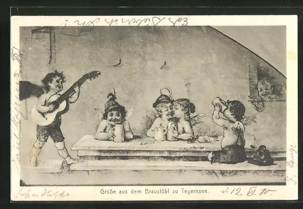AK Tegernsee, Gasthaus Braustübl, Wandgemälde mit Engeln