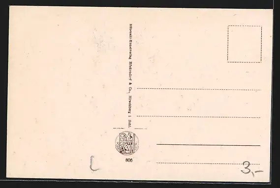 Personenbezogene Daten auf der Rückseite der Karte wurden durch blauen Textmarker unkenntlich gemacht. Die blauen Stellen sind auf die Vorderseite durchgeweicht und wirken sich negativ auf das Postkartenfoto aus