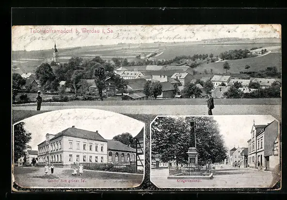 AK Teichwolframsdorf b. Werdau, Gasthof zum grünen Tal, Kriegerdenkmal, Teilansicht