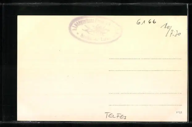 Personenbezogene Daten auf der Rückseite der Karte wurden durch blauen Textmarker unkenntlich gemacht. Die blauen Stellen sind auf die Vorderseite durchgeweicht und wirken sich negativ auf das Postkartenfoto aus