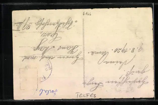 Personenbezogene Daten auf der Rückseite der Karte wurden durch blauen Textmarker unkenntlich gemacht. Die blauen Stellen sind auf die Vorderseite durchgeweicht und wirken sich negativ auf das Postkartenfoto aus