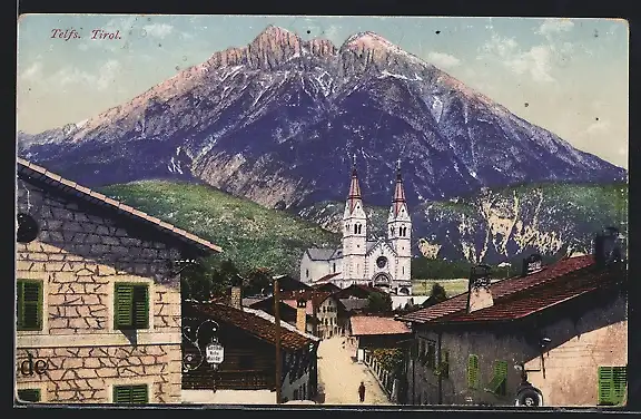 AK Telfs, Blick vom Gasthof Hohe Mulde zur Kirche und aufs Gebirge