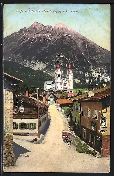 AK Telfs, Strassenpartie am Gasthof Hunde Munde mit Hohe Munde