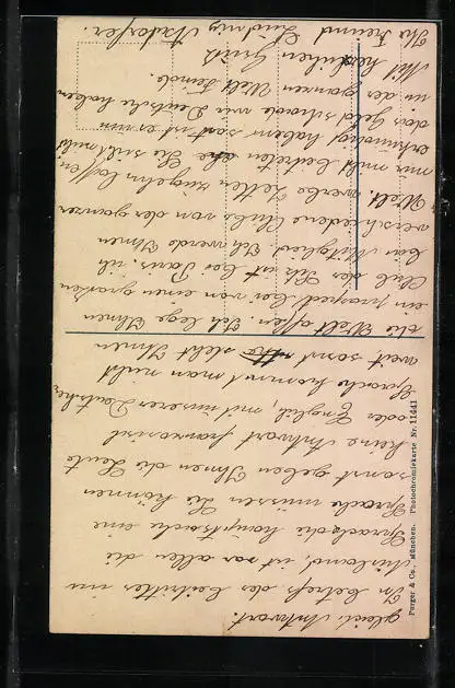 Personenbezogene Daten auf der Rückseite der Karte wurden durch blauen Textmarker unkenntlich gemacht. Die blauen Stellen sind auf die Vorderseite durchgeweicht und wirken sich negativ auf das Postkartenfoto aus