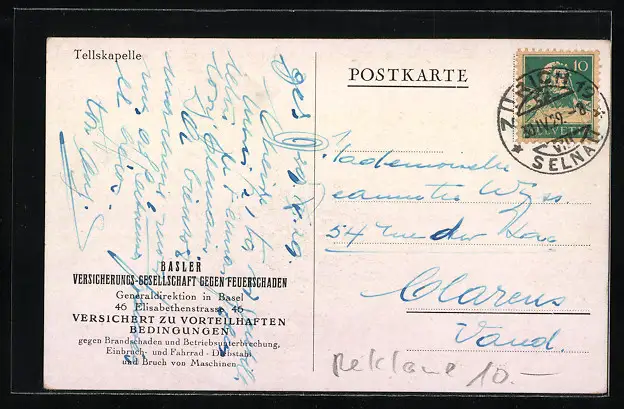 Personenbezogene Daten auf der Rückseite der Karte wurden durch blauen Textmarker unkenntlich gemacht. Die blauen Stellen sind auf die Vorderseite durchgeweicht und wirken sich negativ auf das Postkartenfoto aus