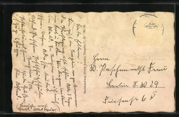 Personenbezogene Daten auf der Rückseite der Karte wurden durch blauen Textmarker unkenntlich gemacht. Die blauen Stellen sind auf die Vorderseite durchgeweicht und wirken sich negativ auf das Postkartenfoto aus
