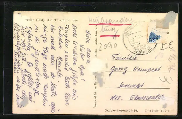 Personenbezogene Daten auf der Rückseite der Karte wurden durch blauen Textmarker unkenntlich gemacht. Die blauen Stellen sind auf die Vorderseite durchgeweicht und wirken sich negativ auf das Postkartenfoto aus