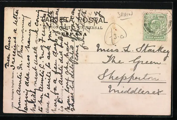 Personenbezogene Daten auf der Rückseite der Karte wurden durch blauen Textmarker unkenntlich gemacht. Die blauen Stellen sind auf die Vorderseite durchgeweicht und wirken sich negativ auf das Postkartenfoto aus