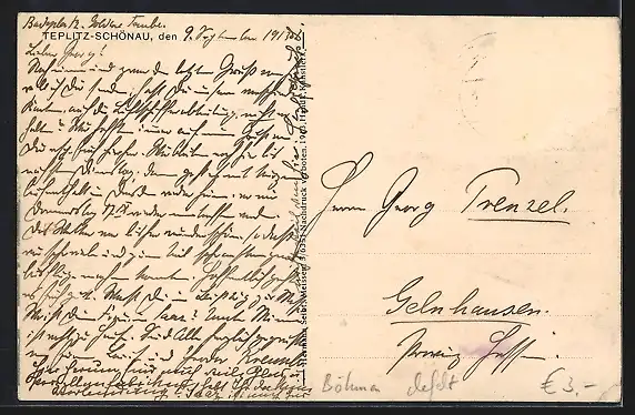 Personenbezogene Daten auf der Rückseite der Karte wurden durch blauen Textmarker unkenntlich gemacht. Die blauen Stellen sind auf die Vorderseite durchgeweicht und wirken sich negativ auf das Postkartenfoto aus