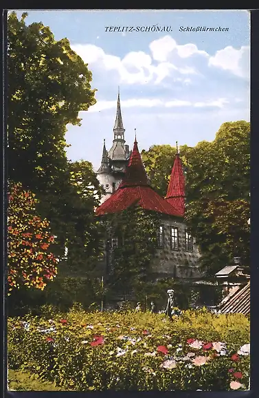 AK Teplitz-Schönau, Schlosstürmchen und Blumenwiese