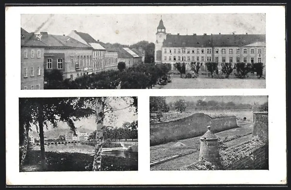 AK Terezin, Ortsansicht, Paradeplatz und Flusspartie
