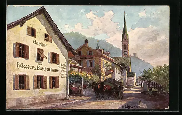 AK Terlan a. d. Etsch, Gasthof von H. Gesser z. Buschen-Hans und Kirche