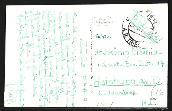 Personenbezogene Daten auf der Rückseite der Karte wurden durch blauen Textmarker unkenntlich gemacht. Die blauen Stellen sind auf die Vorderseite durchgeweicht und wirken sich negativ auf das Postkartenfoto aus