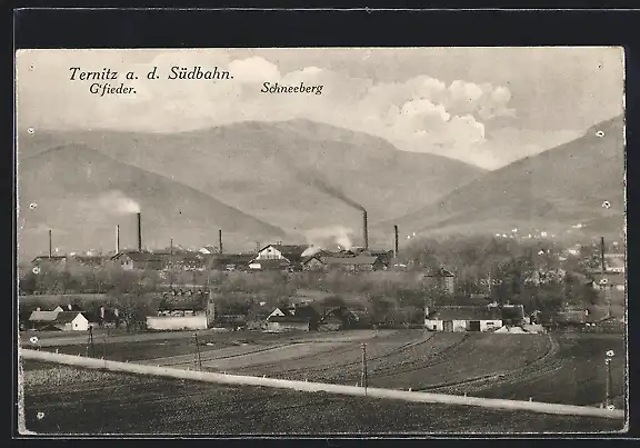 AK Ternitz a. d. Südbahn, Ortspartie mit G`fieder und Schneeberg