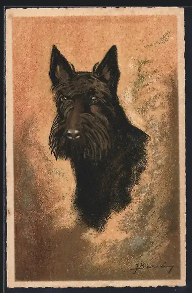 AK Terrier vor gelb-grün-braunem Hintergrund