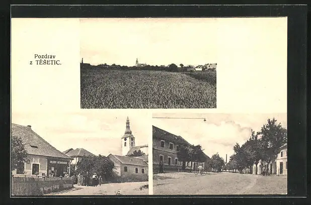 AK Tesetice, Strassenpartie mit Geschäft, Ortspartie, Teilansicht