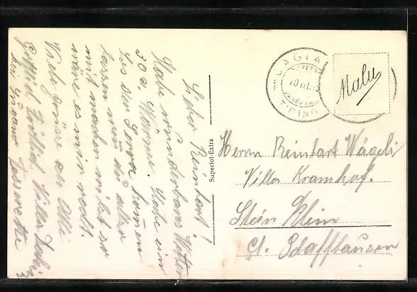 Personenbezogene Daten auf der Rückseite der Karte wurden durch blauen Textmarker unkenntlich gemacht. Die blauen Stellen sind auf die Vorderseite durchgeweicht und wirken sich negativ auf das Postkartenfoto aus