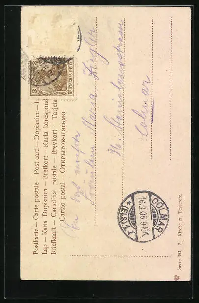 Personenbezogene Daten auf der Rückseite der Karte wurden durch blauen Textmarker unkenntlich gemacht. Die blauen Stellen sind auf die Vorderseite durchgeweicht und wirken sich negativ auf das Postkartenfoto aus