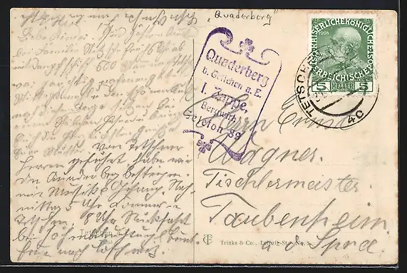 Personenbezogene Daten auf der Rückseite der Karte wurden durch blauen Textmarker unkenntlich gemacht. Die blauen Stellen sind auf die Vorderseite durchgeweicht und wirken sich negativ auf das Postkartenfoto aus