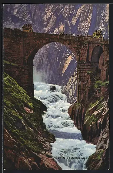AK Teufelsbrücke, Ansicht mit Wasserfall
