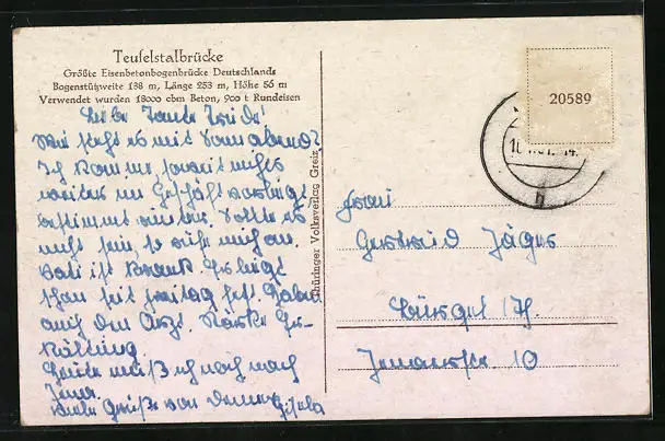 Personenbezogene Daten auf der Rückseite der Karte wurden durch blauen Textmarker unkenntlich gemacht. Die blauen Stellen sind auf die Vorderseite durchgeweicht und wirken sich negativ auf das Postkartenfoto aus