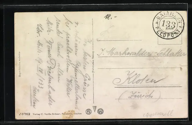 Personenbezogene Daten auf der Rückseite der Karte wurden durch blauen Textmarker unkenntlich gemacht. Die blauen Stellen sind auf die Vorderseite durchgeweicht und wirken sich negativ auf das Postkartenfoto aus